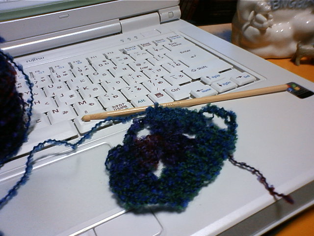編み物で手首を壊した私ですが、今日は仕事もしてないし~と、バプーシュカを作ろうとちょっとだけ編みましたら、こんだけでもう痛いです(;_;)